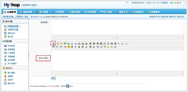 • 獲取在線(xiàn)客服安裝代碼,然后登陸Hishop后臺(tái),進(jìn)入店鋪管理》網(wǎng)店基本設(shè)置,找到“自定義頁(yè)尾”,點(diǎn)擊“HTML代碼”按鈕,把在線(xiàn)客服代碼復(fù)制粘貼到編輯框,點(diǎn)擊保存。