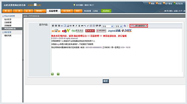 • 進(jìn)入SHOPEX4.8網(wǎng)站后臺(tái),選擇菜單"頁(yè)面管理"->"網(wǎng)站內(nèi)容管理"->"網(wǎng)頁(yè)底部信息",然后點(diǎn)擊窗口右上角"HTML源碼編輯模式"按鈕,切換到源代碼界面,將365webcall客服代碼加入到網(wǎng)頁(yè)底部信息代碼最后面保存即可。