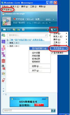 如果選擇綁定MSN模式,安裝完客戶(hù)端后,需要重新啟動(dòng)MSN,啟動(dòng)后MSN的菜單上將增加了“天天在線”這個(gè)菜單,點(diǎn)擊“顯示監(jiān)控窗口”即可查看有誰(shuí)在訪問(wèn)您的網(wǎng)站。