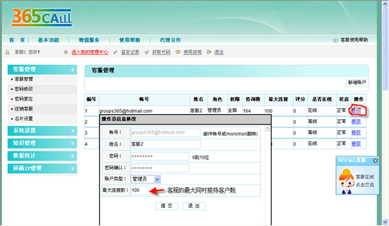 需要修改客服姓名和類型,可選中某個(gè)客服,點(diǎn)擊“修改”: